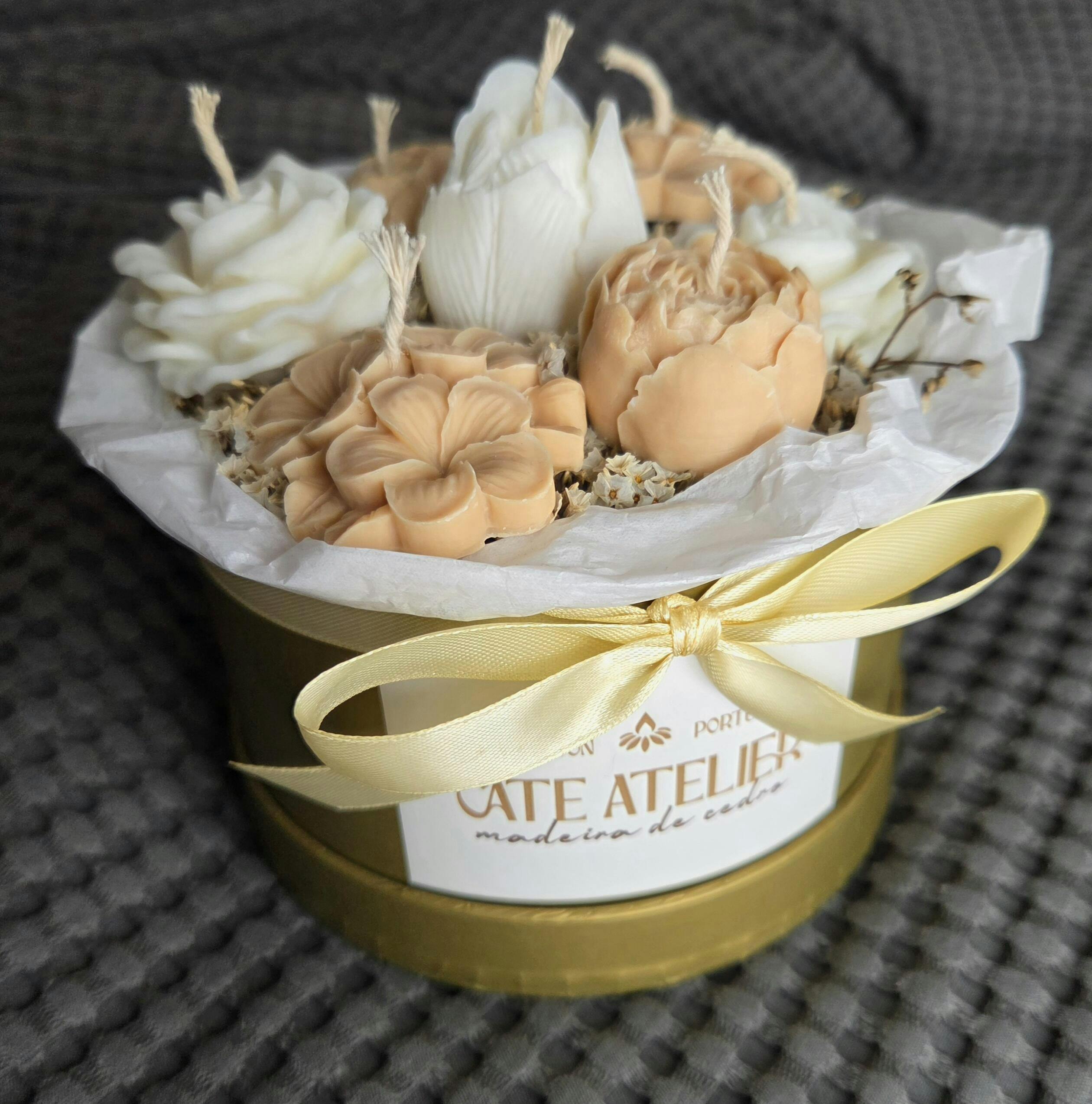 Os Bouquets Cate Atelier são arranjos artesanais de velas decorativas apresentados em caixas redondas brancas. Cada bouquet é único - moldado à mão, composto por flores cuidadosamente escolhidas e finalizado com laço decorativo e elementos naturais secos.
